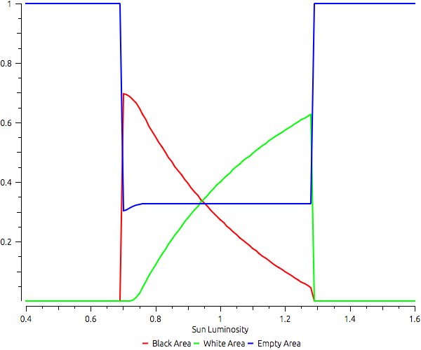 Daisyworld example using multiple Runs factorial strategy. It simulates Daisyworld using different sun luminosities to investigate the final distribution of black, white, and empty areas. Based on the Model described in Wood, A. J., G. J. Ackland, J. G. Dyke, H. T. P. Williams, and T. M. Lenton (2008), Daisyworld: A review, Rev. Geophys., 46.