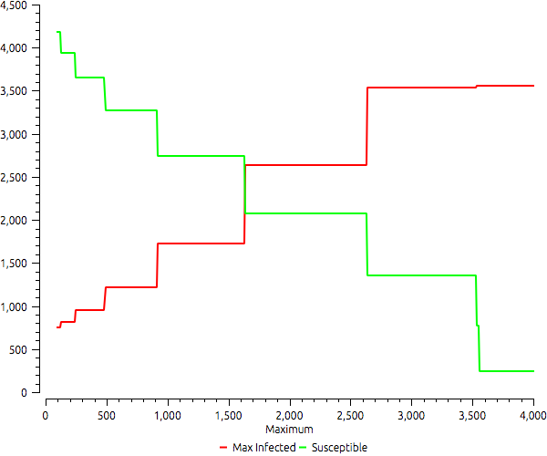 Example that uses MultipleRuns to compute wow many cells agents moving randomly can reach. It uses a model that starts with a given number of agents randomly distributed in space and runs a small number of steps. The output shows a logistic growth of cells where at least one agent has passed during each simulation. Note that the curve sometimes has a negative derivative. As we increase the initial number of agents, sometimes the number of covered cells diminishes due to randomness.