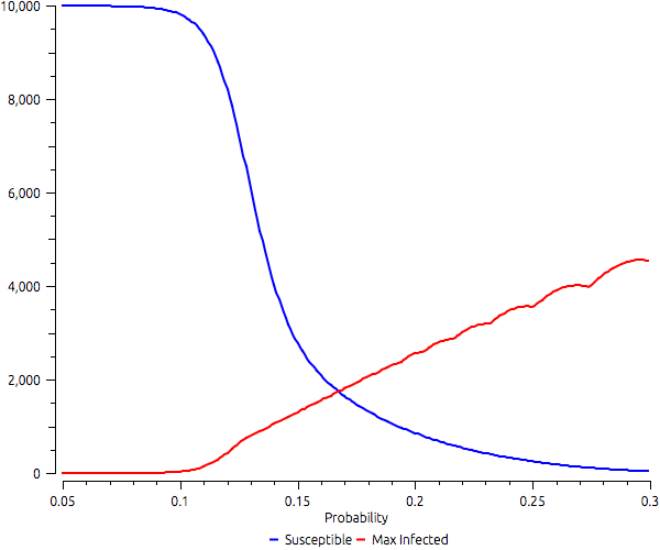 Investigating the probability of infection in a Susceptible-Infected-Recovered (SIR) model. The example shows how susceptibles and the maximum number of infected varies according to the probability of infection.