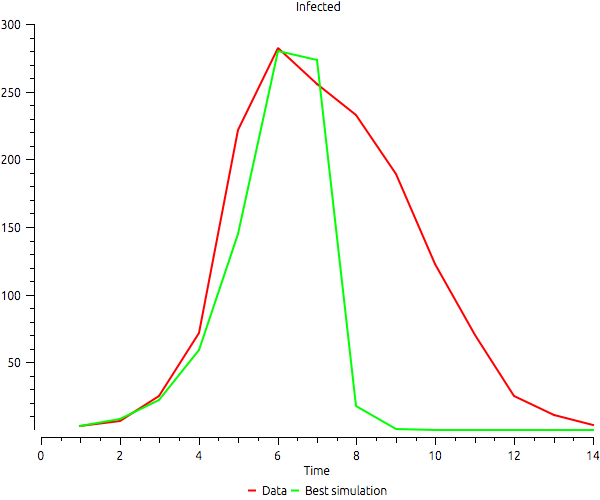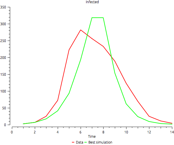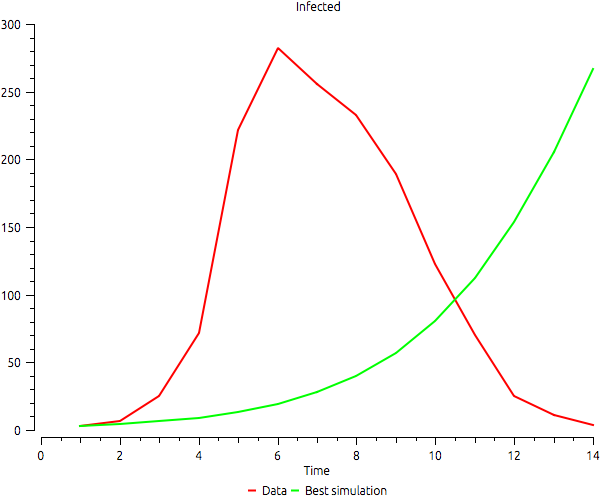 An example of a bad calibration. It uses a SIR model and calibrates it with real data using only the difference between the maximum number of infected as error. The calibration is perfect, but the time when the maximum is reached is completely different. The data available shows the maximum in time 6, but the fittest configuration of the model reaches the maximum only in the end of the simulation.
