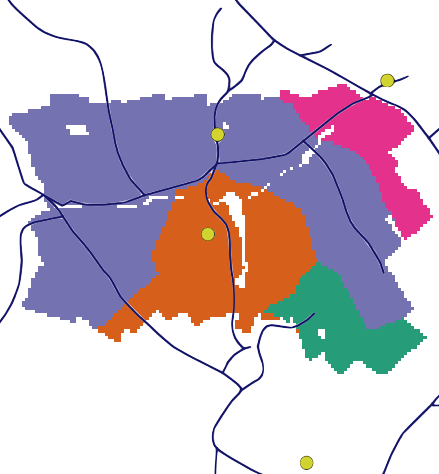 Computes neighborhoods based on Euclidean distances from cells to all communities. It considers a neighbor only a community is less or equals than 4km from the centroid of the cell. The output image shows how many neighbors each cell has.